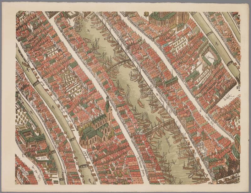 In de 16e eeuw maakte Cornelis Anthonusz. een schitterende kaart van Amsterdam. Je kunt er de kerken, steegjes, pakhuizen en tuinen precies herkennen.